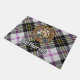 Clan MacPherson crest badge surrounded by a strap and buckle over dress tartan background. Custom text.