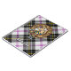 Clan MacPherson crest badge surrounded by a strap and buckle over dress tartan background. Custom text.