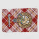 Clan MacPherson crest badge surrounded by a strap and buckle over red dress tartan background. Custom text.
