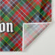 Clan MacPherson crest badge surrounded by a strap and buckle over tartan background. Custom text.