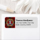 Clan MacQueen crest badge surrounded by a strap and buckle over tartan background. Custom text fields for name and address.
