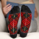 Clan MacQueen crest badge surrounded by a strap and buckle over tartan background. Custom top stripe colour. Custom text on each sock.