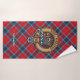 Clan MacTavish crest badge surrounded by a strap and buckle over tartan background. Custom text on each towel.