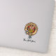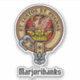 Clan Marjoribanks crest badge surrounded by a strap and buckle over tartan background. Custom text.