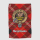 Clan Marjoribanks crest badge surrounded by a strap and buckle over tartan background. Custom text.