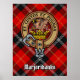 Clan Marjoribanks crest badge surrounded by a strap and buckle over tartan background. Custom text.