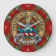 Clan Morrison crest badge surrounded by a strap and buckle over red tartan background. Custom text.