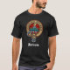 Clan Morrison crest badge surrounded by a strap and buckle over red tartan background. Custom text.