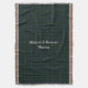 Colourful custom fringe end throw blanket made with graphics of the green, blue, black traditional Scottish clan Murray tartan plaid pattern. Khaki tan old world style text can be personalised to read what you want. Lovely gift idea for anyone.