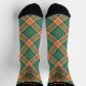 Clan Pollock crest badge surrounded by a strap and buckle over tartan background. Custom top stripe colour. Custom text on each sock.