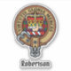 Clan Robertson crest badge surrounded by a strap and buckle over tartan background. Custom text.