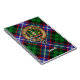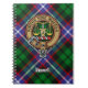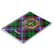 Clan Russell crest badge surrounded by a strap and buckle over tartan background. Custom text.