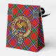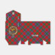 Clan Sinclair crest badge surrounded by a strap and buckle over red tartan. Custom text and monogram.