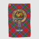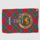 Clan Sinclair crest badge surrounded by a strap and buckle over tartan background. Custom text.
