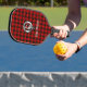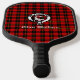Stylish pickleball paddle with Scottish Clan Wallace crest badge and customisable text on tartan background