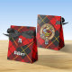 Clan Wallace crest badge surrounded by a strap and buckle over tartan background. Custom text and monogram.