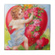 A beautiful vintage tile featuring a beautiful cherub with roses in front of a burning heart, painted by the American illustrator/commercial artist Ellen Hattie Clapsaddle.