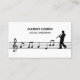 A simple business card with a silhouette of a clarinetist walking on a sheet of music including a treble clef and notes. The back comes with fully customisable contact information decorated by icons and a clarinet illustration. Perfect for clarinetist, lessons, teacher, musician performer, concert, etc.