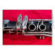 A close up of the lower joint section of a clarinet. The black and silver contrast nicely with the red background! Great for for the clarinetist in your life.