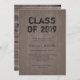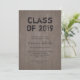 Rustic graduation party design for guys featuring the words "Class of 2019", in black distressed font, against image of brown textured background. The back of this high school graduation party template is adorned with simple photo of worn wood surface. Easily personalise with your own party details, favourite fonts and colours.