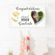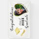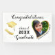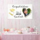 Create a unique white, black and golden yellow graduation banner for the class of 2025 graduate with a heart-shaped photo, Congratulations saying, and grad's cap and diploma illustrations. Please personalise with the graduate's name and surname, upload a custom photo via template, and change a year before ordering.