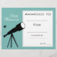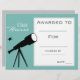 A school class academic award certificate award with a telescope science theme image in perfect for encouraging a young science or astronomy student. You can write in your own details. A great resource for any type of classroom teacher.