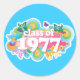 Did you graduate in the Class of 1977? It's time to show some class pride with this beautiful retro style 1977 graduate logo featuring swirls and stars in pink, green, blue and purple. Great for a 1977 class reunion or grab a reunion gift or 1977 stocking stuffer for a friend who graduated with you way back when.
