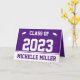 Front: This royal purple and white graduation card says 'Class of 2023' in large white text. (You can change the year if you need to.) At the bottom, there's royal purple text you can change to show the actual graduate's name. White graduate's caps are on either side of the phrase "Class Of". Inside: White text reads 'Congratulations!'. At the bottom, there's a line of white display text you can edit to show the sender's name(s).