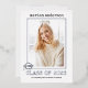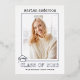 Class of 2023 typewriter real silver foil graduation photo invitation. The back includes a grey and white pattern with stripes.
