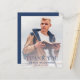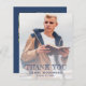 Modern graduation thank you card featuring a custom vertical photo on the front and a horizontal photo on the reverse. The words "Thank You" appear in navy blue sketched typography. Add your name and year of graduation below in navy blue sans serif font. Personalize the reverse side with a message and signature line of your choice in white sans serif font on a navy blue background. Easily replace the sample images with your own photos. A white gradient screen helps ensure the text on the front of the card pops. Ideal for high school or college graduation.