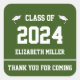 These dark green and white graduation favour stickers say 'Class of 2024' in large white text. (You can change the year if necessary.) At the bottom, there's white display text you can change to show the correct name for the graduate. White graduate's caps are on either side of the phrase "Class Of". You can also edit the custom message for your guests. (Shown: Thank You For Coming)