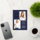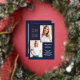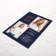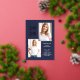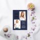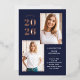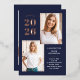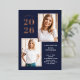 These modern and stylish grad party invitations feature three photos of the graduate, plus their 2024 graduation year in bold, rose gold foil text on a dark navy blue background. Plenty of gold foil accents add an elegant touch to the front of the card.
