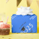 This graduation wrapping paper offers a 2025 graduation design in blue, black and white with custom text for the graduate's name. The text reads: Class of 2023 Grad. A black mortarboard sits on top of the zero in the year. The background colour can be changed.