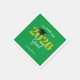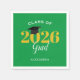 This green personalised paper napkin is a fun accent to your graduation party. The gold and white text reads: Class of 2025 Grad. A black mortarboard sits on top of the zero in the year.