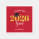 This red personalised paper napkin is a fun accent to your graduation party. The gold and white text reads: Class of 2025 Grad. A black mortarboard sits on top of the zero in the year.