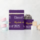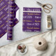 This graduation wrapping paper is deep purple. The elegant wrapping paper has a text pattern for the graduate's first and last name and Class of 2025. The name (Shown: Elizabeth Anderson) appears in an elegant faux (not foil) gold script. The other text is white. All of the text can be edited.