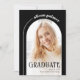 Class of 2025 GRADUATE arch black photo Announcement. The stylish and minimalistic design emphasizes the word 'GRADUATE' in decorative lettering, capturing the essence of the announcement. The focal point of the announcement is an arch that features a picture of the graduate, accompanied by a sleek curved line on the left side, emanating an air of sophistication and grace. As you move towards the right side, the graduate's name takes centre stage, making a strong statement. On the back of the announcement, you will discover another photograph and more details.
