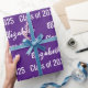 The wrapping paper is royal purple. It has a text pattern for the graduate's name and Class of 2025. The name (Shown: Elizabeth) appears in an elegant white script. The other text is also white. All of the text can be edited.