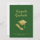 Create a unique green and gold personalised graduation announcement with your graduate's photo for the class of 2025. This design is decorated with a graduate cap and diploma illustrations in golden yellow colours. The template makes it easy to personalise the grad announcement with a name, year, school name, photo and other text.