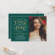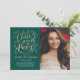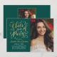 Stylish two-sided graduation announcement card and party invitation features a portrait of the graduate with adjacent elegant faux gold foil design in script with pretty scroll accents. Front of the card also includes custom gold and white coloured text that can be personalised for the event. The back of the card announces the graduation with a second photo and custom text for the graduate's name, class year, and school. The deep emerald green background colour can be modified to coordinate with the photo or party colours. Photo tip: crop your second photo to a square format before uploading to the site.