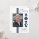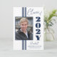 This elegant Class of 2025 graduation party invitation has a stylish design with navy blue stripes, photo frame, and text on a white background.