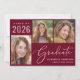 Simple Class of 2025 burgundy red graduation announcement featuring a 3 picture photo collage and "Graduate" in an elegant white script. Add the grad's name, class year and school in modern white typography.