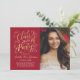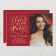 Stylish two-sided graduation announcement card and party invitation features a portrait of the graduate with adjacent elegant faux gold foil design in script with pretty scroll accents. Front of the card also includes custom gold and white coloured text that can be personalised for the event. The back of the card announces the graduation with a second photo and custom text for the graduate's name, class year, and school. The deep red background colour can be modified to coordinate with the photo or party colours. Photo tip: crop your second photo to a square format before uploading to the site.