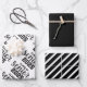 This image showcases a set of three wrapping paper designs. The top sheet features a repeating pattern of the phrase "senior CLASS OF 2025" in a mix of bold and cursive fonts, arranged diagonally on a white background. The middle sheet is a solid black colour, providing a sleek and elegant option. The bottom sheet displays a black and white diagonal stripe pattern, adding a modern and stylish touch. This set is perfect for celebrating the achievements of the graduating class of 2025, offering a variety of designs to suit different tastes and occasions.