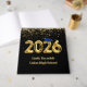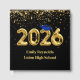 Class of 2026 with a blue graduation cap and gold confetti on a black background.