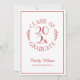 Send elegant graduation invitations for your graduate's celebration featuring a chic red on white typography emblem which reads: CLASS OF [YEAR] GRADUATE with the words curving around the year in the middle with curved botanical leaves along each side of the circular design. Below the emblem is the graduate's name in a red script font and their school in a sleek serif font. A fine red rectangle creates a border near the edge.