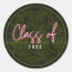 Pink neon sign inspired "Class of" script over boxwood inspired background with custom white text and trim.