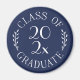 Chic white on navy blue typography emblem reads: CLASS OF [YEAR] GRADUATE with the words curving around the year in the middle with curved botanical leaves along each side of the circular design. Customize the year in the sidebar. Makes a fun graduation gift.