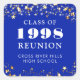 Personalised royal blue high school or college class reunion square stickers or envelope seals for any graduating class (the year is editable) with your class year and school name. The design features gold stars and string lights in your choice of colours (shown in royal blue and gold) you can change to your school colours or coordinating party theme colours. ASSISTANCE: For help with design modification or personalisation, colour change, resizing, transferring the design to another product or you would like coordinating items, contact the designer BEFORE ORDERING via the Zazzle Chat MESSAGE tab below or email makeitaboutyoustore@gmail.com.