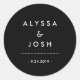 This stylish, minimalist wedding sticker has white text with your names and wedding date on a dark black background.